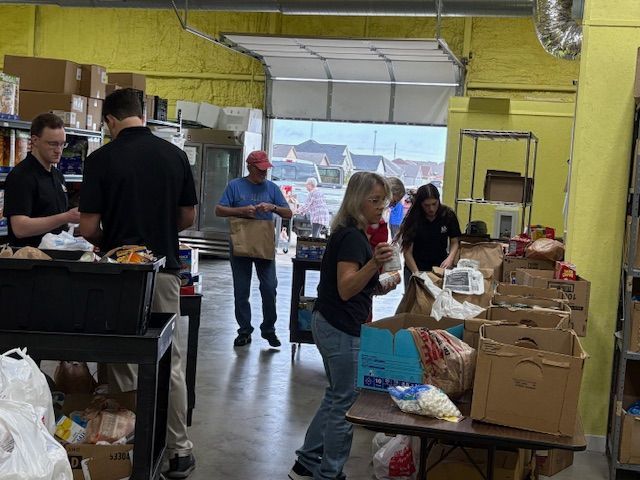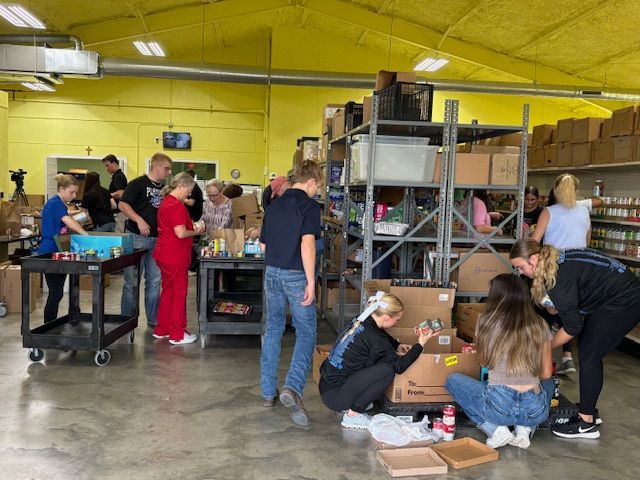 Volunteers from throughout the community show up at the Food Bank that day to help collect the donations of food and money. Food items are sorted and shelved as appropriate.